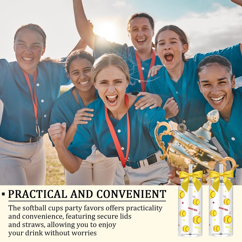 AKPMJ 12 Pack 14.2 oz Plastic Cups with Lids and Straws Clear Reusable Cups Twist Bows Tumbler Bottle for Birthday Sports Themed Party Favors Decorations Bulk (Softball)