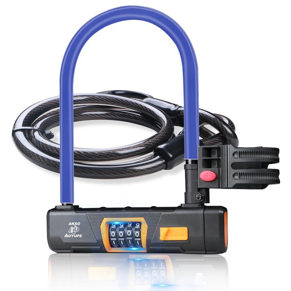 Akso Aoyupe Blue Silicone 4-Digit Resettable Combination Heavy Duty Anti-Theft Locks and 12mm x1.2m Cable,Keyless Lock for Outdoor,U-Lock with Sturdy Mounting Bracket,for Mountain Bikes,(1 Set)