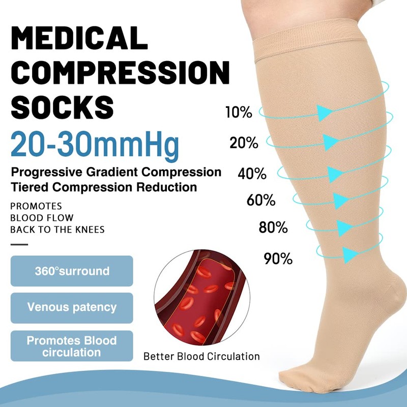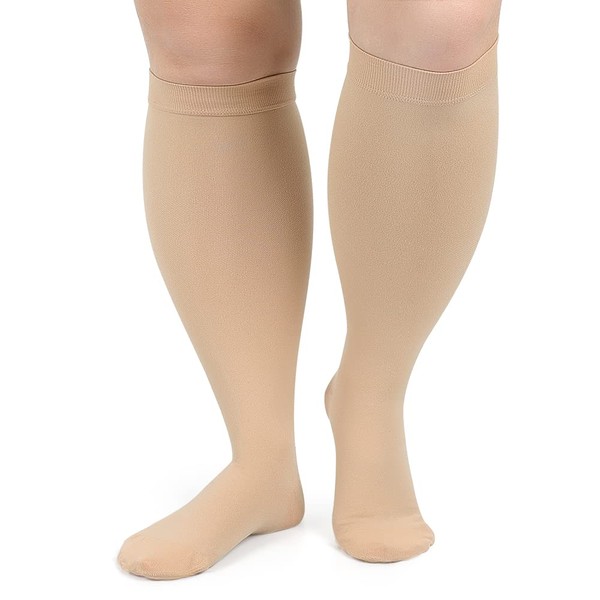 AKSO MEDICOS Plus Size Compression Socks, 20-30 mmHg Compression Socks for Women & Men, Wide Calf Knee High Stocks for Circulation Support Varicose Veins Swelling Edema,Beige 2XL