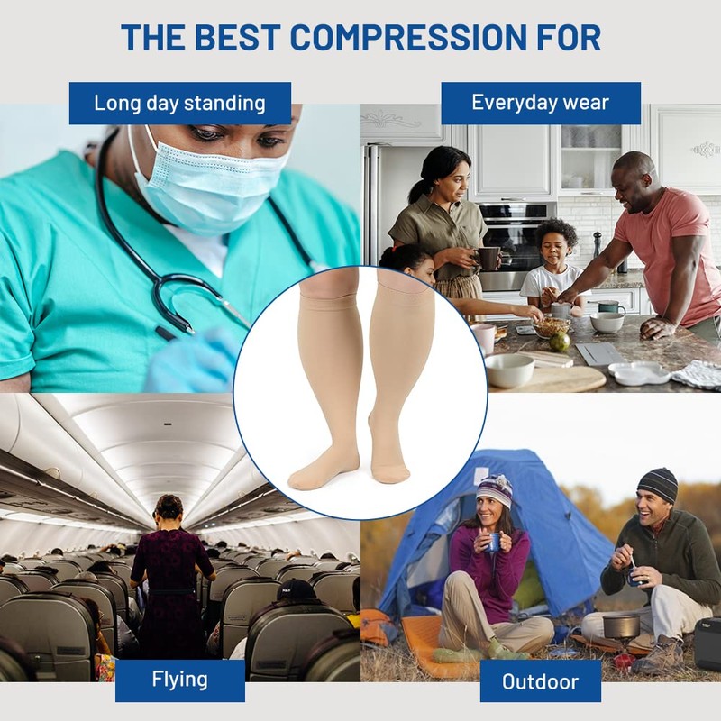 - 【Comfortable and Breathable】Our compression socks for women are made of superior nylon fabric, comfortable and longevity. The stretchy yet tough nylon fit closely from your toe to your knee, the wide top band prevents rolling, easy to put on and take off. Sweat-wicking and breathable fabric keep legs dry while providing support a full range of motion for feet & legs.