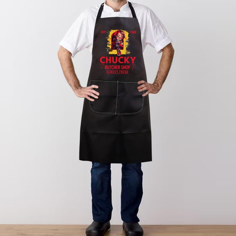 AKTAP Chucky Merchandise Apron with Pockets, Chucky Butcher Shop Always Fresh with Pockets, Chucky Doll Bibs, Horror Movie Gifts for Fans, Ap