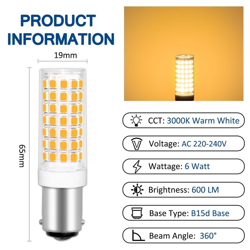 - ★【Durable quality】: B15d bayonet cap (double contact), diameter 19 x 65 mm, AC 220-240 V, easy to install. The main materials are ceramic, stable quality. Instant illumination. Lifespan of 30,000 hours. No lead or mercury. No noise or flicker.