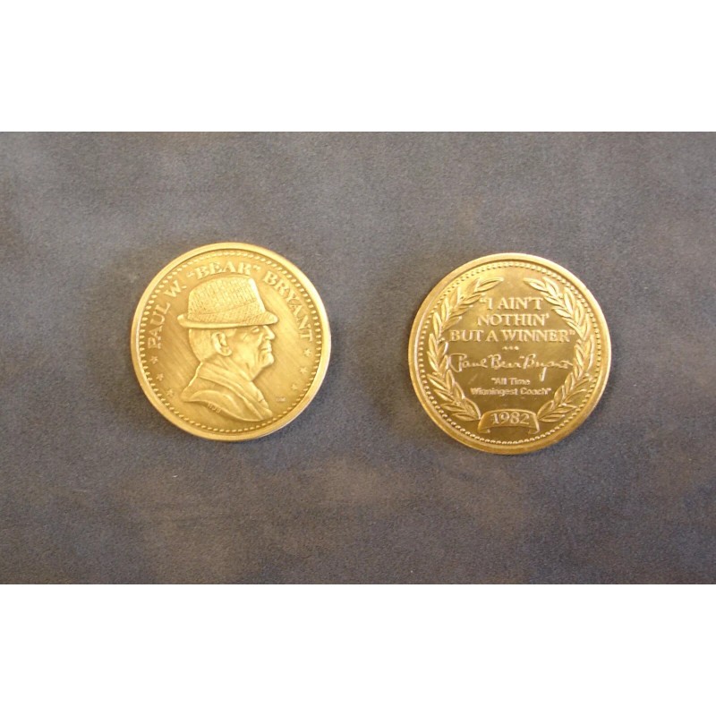 A beautiful bronze coin commemorating the legendary Alabama coach Paul "Bear" Bryant. Great to use as an accent piece in framing or as a poker guard or golf marker.
