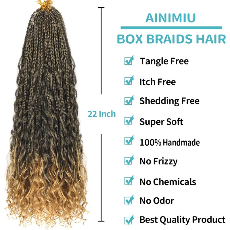 - Hair length: 22inch, Hair weight:80g,14strands/pack Packing List: 22inch Bohemian goddess box braids Crochet hair.Available Hair Colors: 1B,T27#.