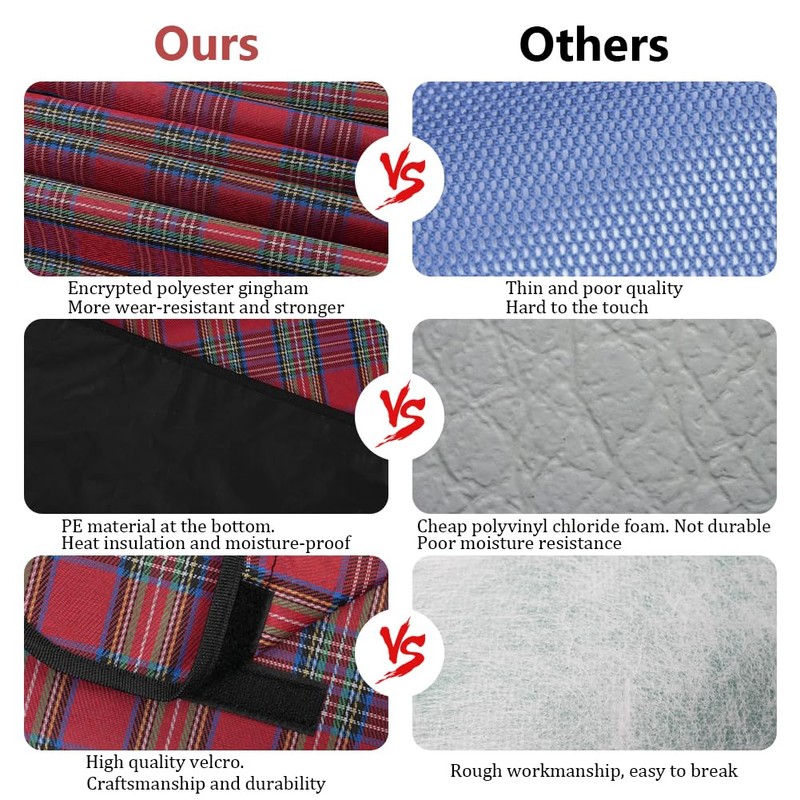 - High-quality material: Our picnic blanket is made of high-quality polyester plaid fabric, which is waterproof, moisture-proof, tear-resistant and tough on the back. Waterproof bottom is enough, lightweight and comfortable.