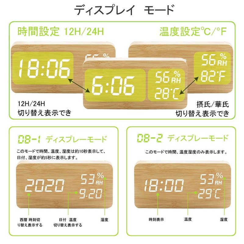 - Multi-functional Alarm Clock: 1. Sound Sensor: Lights up when reacts to sound at least 60 db and turns off after about 10 seconds when it is silent. 2. Alarm: Up to 3 alarms. 3. 3 levels of brightness adjustment: Adjust the brightness as you want, energy-saving and gentle on your eyes. 4. Double display: 12/24 hour display, time / calendar, temperature display, Celsius display and Fahrenheit display. Humidity (±3% RH) Temperature (±1°C); Settings Memory: Even if the power runs out, there is no need to reset the memory function. 6. Two types of power supply: USB powered and dry battery