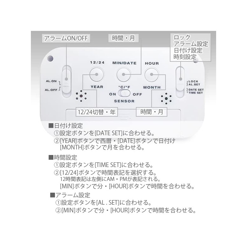 - Large text is very easy to read Besides the time, there is also a date and temperature display