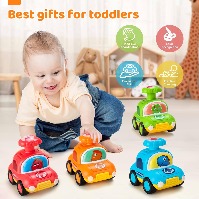 - Press and Go Cars:No batteries required. Just press the knob and let it run!Easy to play, great for kids ages 2 and up