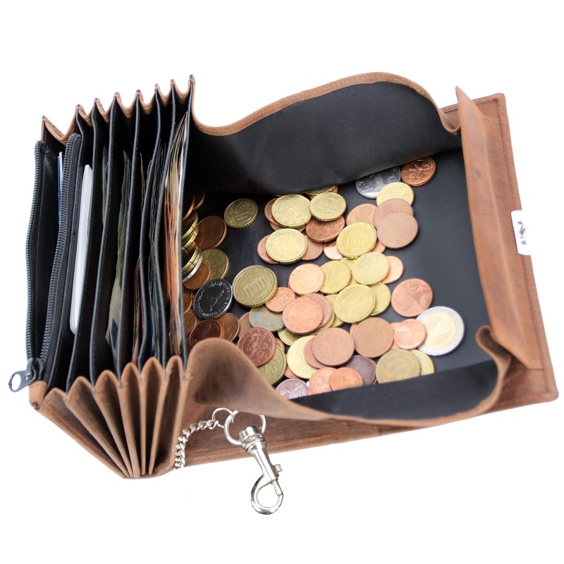 - Features: 6 note compartments for banknotes and a wide opening coin compartment, zip compartment (e.g. for tips), slip pocket in the back and a 3-way adjustable step lock