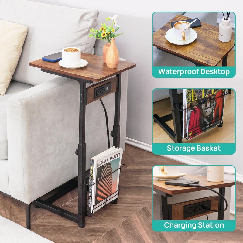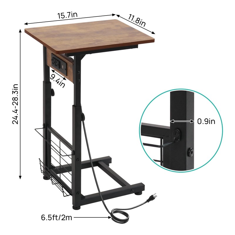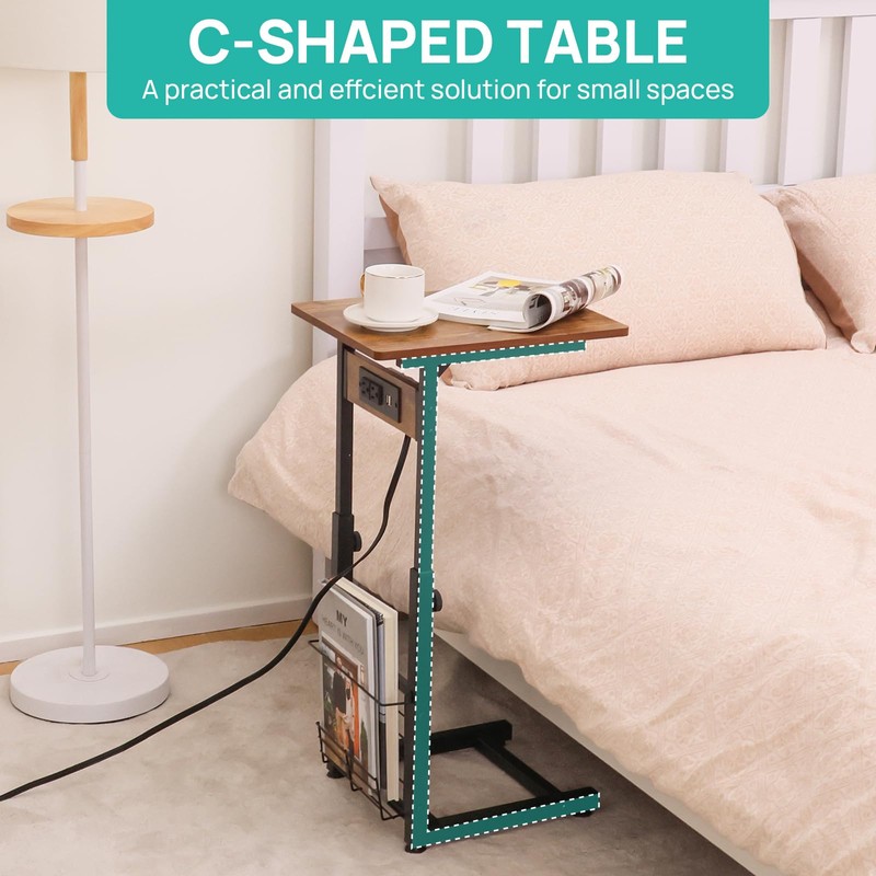 - [Height Adjustable Side Table] Our C shaped side table with charging station can be adjusted height from 24.4-28.3 inches to fits your needs for desk height when you work and relax, it fit most bed and sofa, protect you from headache, neck pain.
