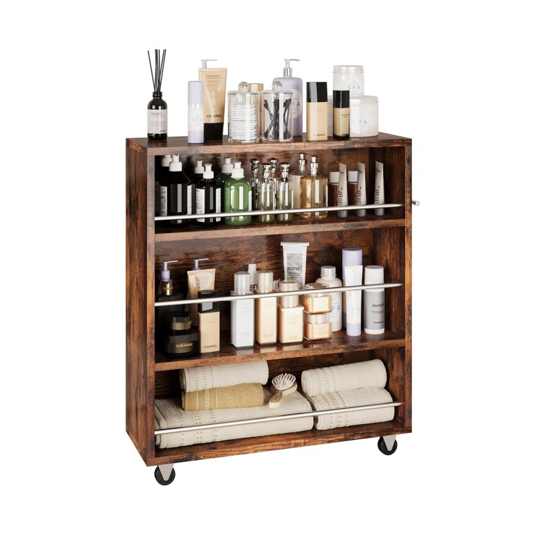 - DURABLE CONSTRUCTION - This utility cart on wheels is made of durable MDF with a traditional design to blend in with any style. And each layer of partition and iron bar and 6 holes can be adjusted, you can easily adjust the height according to your needs. Each sturdy shelf has a 20lb weight limit to support bathroom storage, laundry room organization, and other home storage.