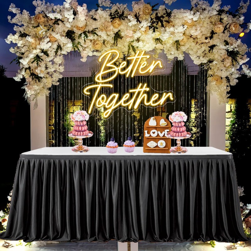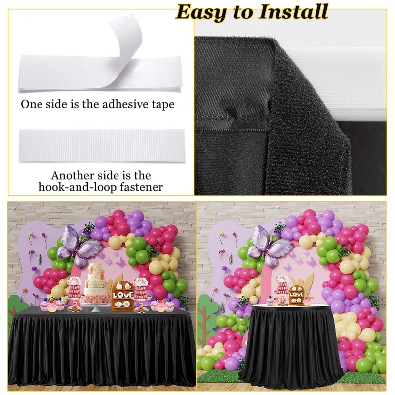 - 【Easy to Install】: Black table cloth 6ft sewn with loop under the top edge, and the package include hook with back adhesive. Stick the hook on the table and put the table skirt top edge right on the hook, the hook and loop stick together, done!