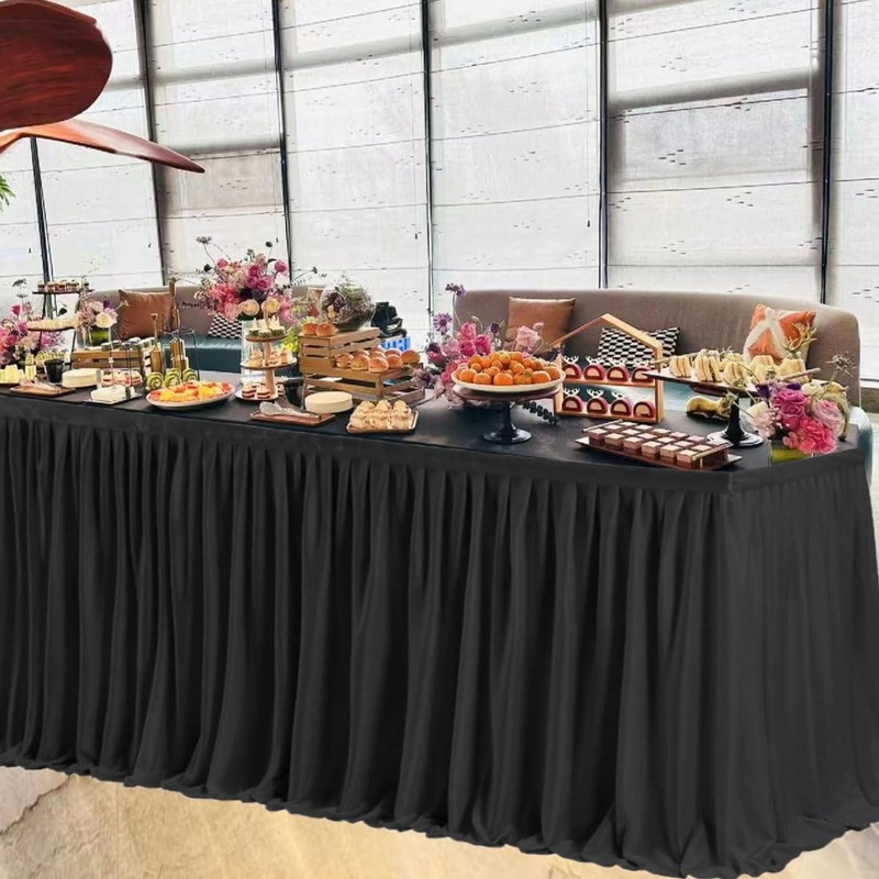 Albassa Black Table Skirt for Rectangle Table 6ft Polyester Table Cloth Wrinkle Resistant Tablecloth with Ruffle for Wedding, Baby Shower, Display Gift Dining Table (Black, 6ft, 72in(L) X30in(H))