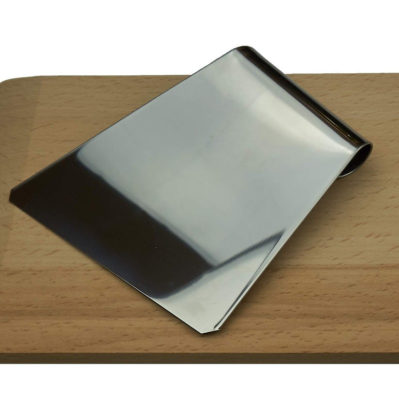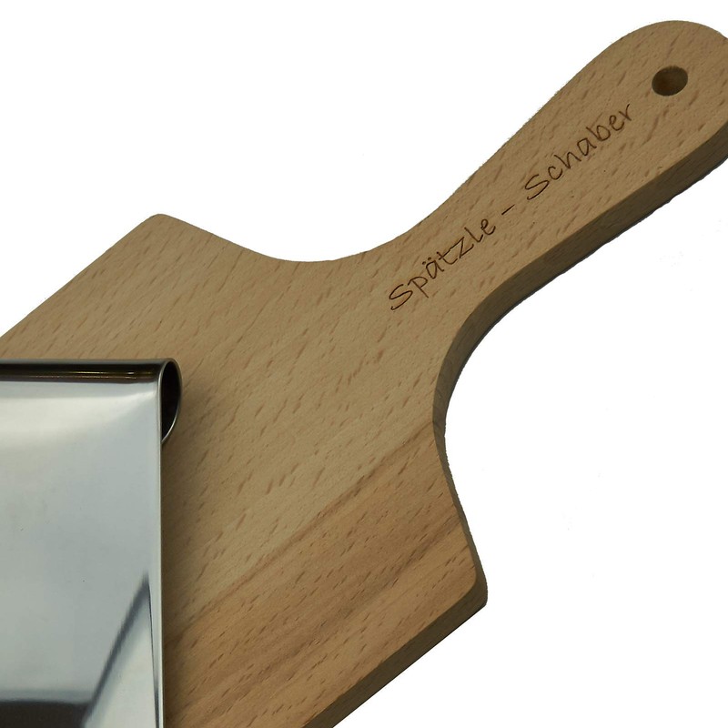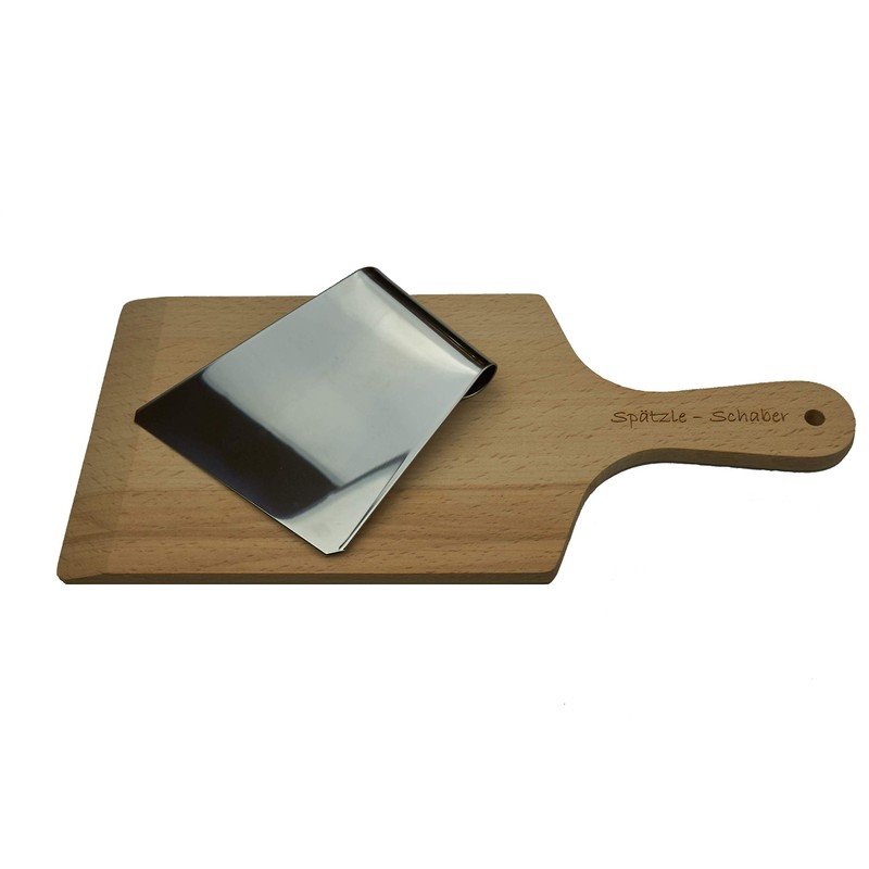 - The stainless steel spaetzle scraper sits comfortably in the hand and is easy to clean. The wooden board can also be used as a snack board or chopping board