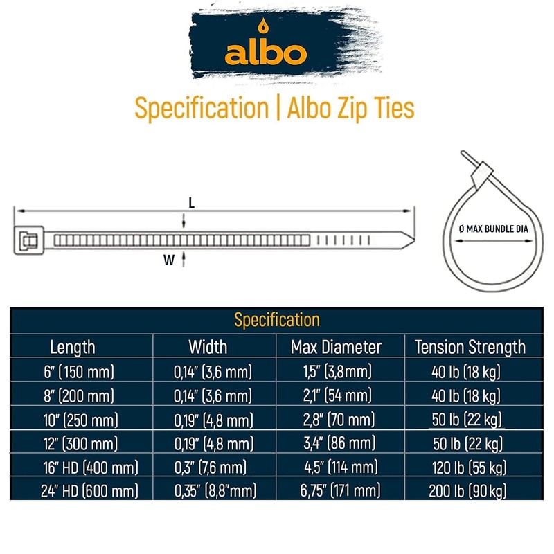 - CABLE TIES SPECIFICATION: 100 Psc, Color: Black, Length: 6 inch/150 mm, Width: 0.14 inch/3.6 mm, Max bundle diameter: 1.5 inch/38 mm. The maximum tensile strength of the 6" silicone cable ties is about 40 lbs.