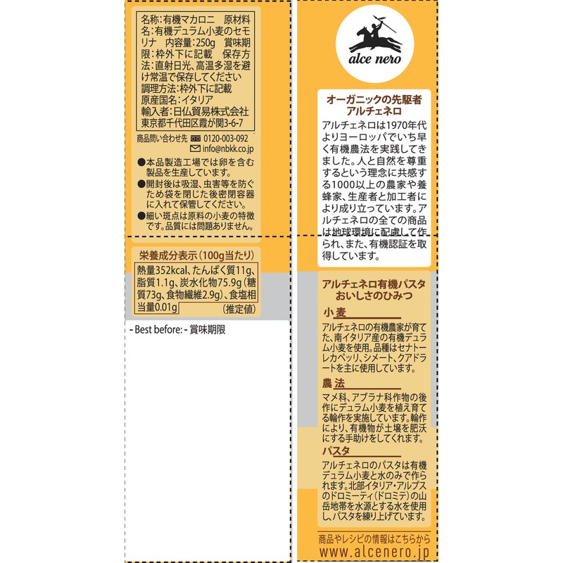 - Ingredients: Organic durum wheat semolina. Contents: 8.8 oz (250 g). Country of Origin: Italy. Boiling Time: 10 minutes