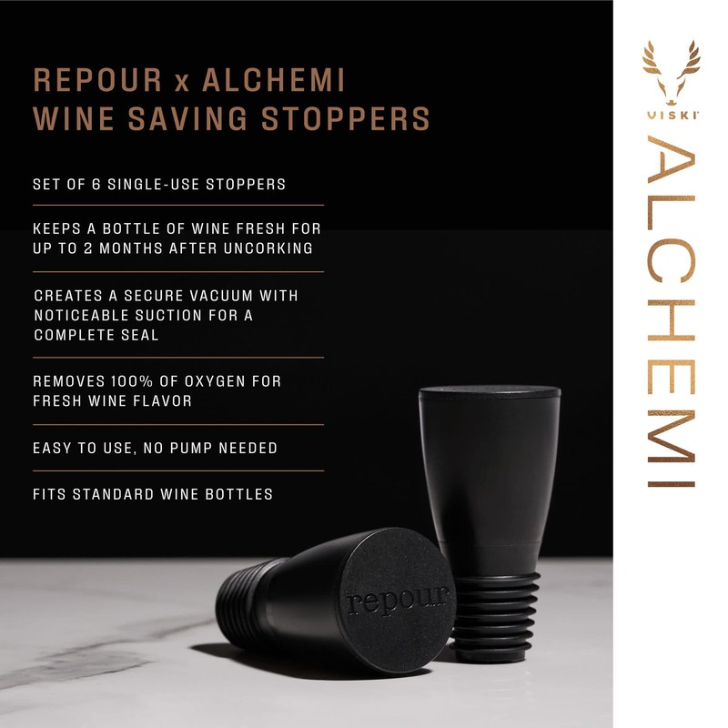 Alchemi Repour Wine Saver Stoppers - Easy to Use Vacuum Seal Wine Stoppers - Removes Oxygen from Wine - Set of 6