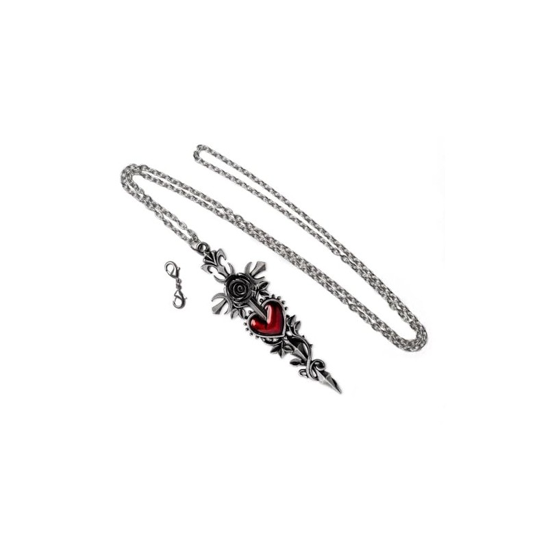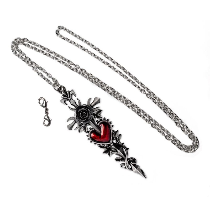 Introducing the 'Cross of the Dark Kiss' pendant-a dramatic statement piece that defies convention and celebrates individuality. Hand Crafted in antiqued English pewter, with meticulous detail, a long cross, adorned with intricately woven ivy and crescent moons. At its heart lies a stunning blood-red enamelled heart, echoing the passion and allure of love's deeper, darker facets. Anchored in its center is a jet black rose, a symbol of eternal beauty and resilience. Versatile and unique, the Alchemy 'Cross of the dark Kiss' pendant comes complete with a long chain that can be worn in multiple ways-whether you prefer it as a double, long, or short piece, this jewellery adapts to your unique sense of style!