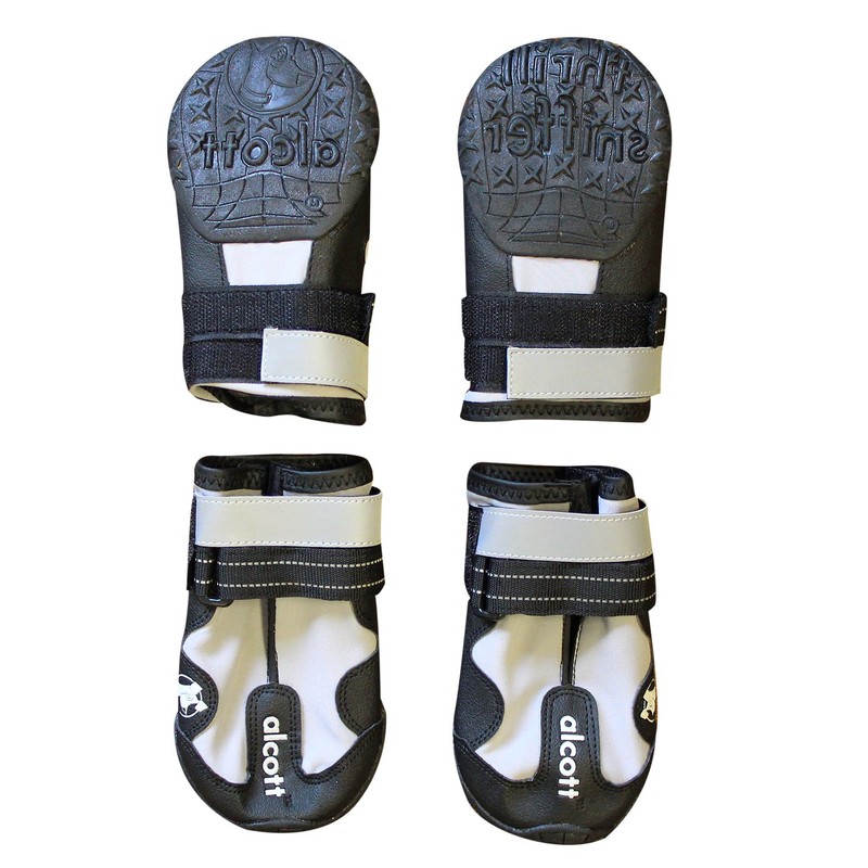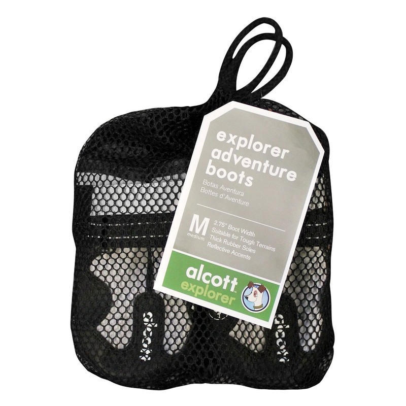 These Medium Alcott Explorer Adventure Boots will help protect your thrill sniffer's paws and pads from hot pavement in the summer, salted sidewalks in the winter and other tough terrain. These boots are 2.75" wide. Two Velcro closures allow for a secure, comfortable hold without interfering with your pet's natural movement. The boots are constructed using heavy duty, weatherproof materials with thick rubber soles that leave a fun message behind wherever they step! If your pet has never worn boots before, it will take some time, patience and plenty of treats for them to adjust to wearing them. Start with one or two boots for short periods of time. Eventually, your thrill sniffer will learn that putting the boots on means that you're about to embark on another great adventure!.