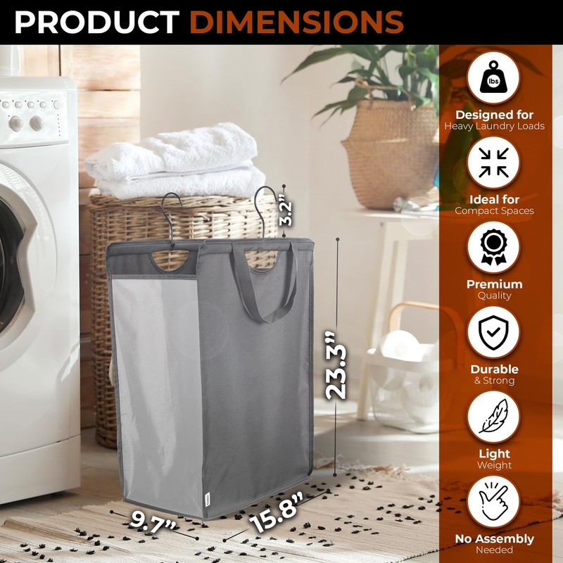 - Easy Setup: With sturdy hooks included, our hanging laundry hampers are easy to install in any room. Whether you need a hanging laundry bag for a small closet or dorm, setup is quick and hassle-free, saving you time and effort. The dimension of the hanging laundry hamper is 10.3" (W) x 15.75" (L) x 22.5" (H) - 59L Capacity.