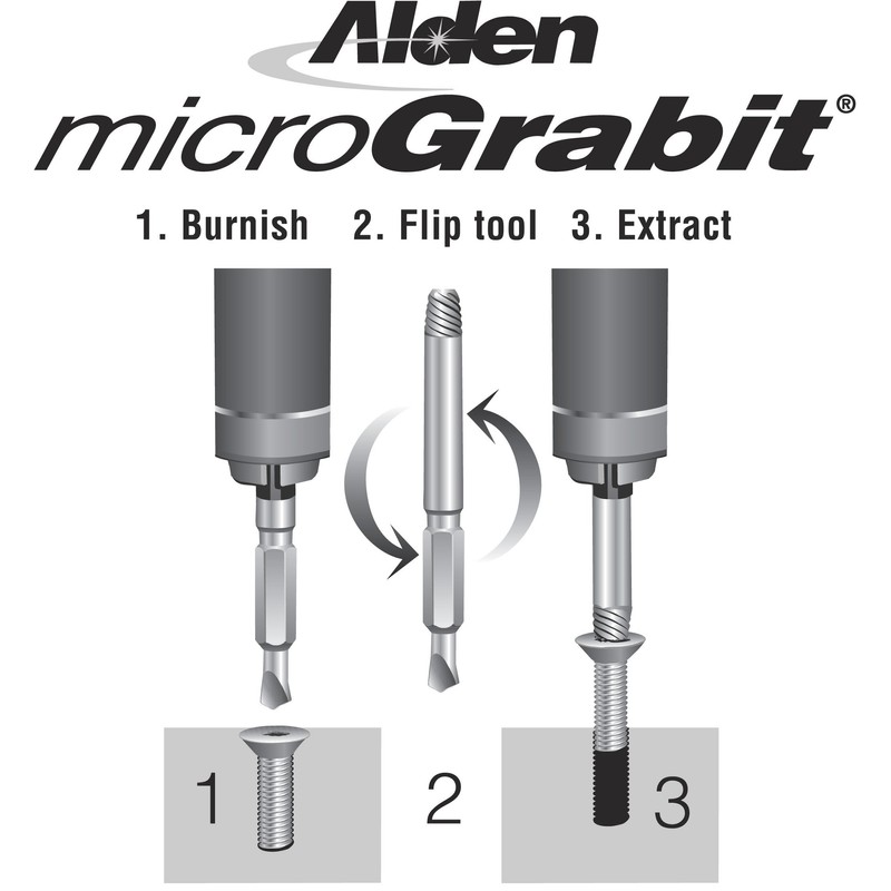 10 piece master Extractor Kit contains the entire range of Alden quality tools such as the Drill-out, Micro Grabit and X-out extractors for quickly and easily removing broken and damaged fasteners. Remove Screws: No.6 - 14; Bolts: No. 5 and 6; No.8; No.10; 1/4 in.; 5/16 in.; 3/8 in.; 1/2 in.; (3 - 12mm). Drill-out is a drill-bit and extractor in one tool; can drill into broken bolts on center and extracts using the Power of the drill. Drill-out incorporates a unique interaction between drill bit and extractor resulting in maximum impact and break out ability. Use in reverse only while drilling and extracting with 3/8 inch variable speed reversible power drill. Micro Grabit extractor can quickly remove broken bolts (flip style) even drill on center using a 1/8 in. variable speed reversible rotary power tool (slow speed) or quality power screw driver with expandable chuck or 3/8 inch reversible power drill for the 2367P. Quickly and easily removes most broken bolts No. 5 and 6 (3mm) to 1.4 inch (6mm) from wood, metal or plastic. Both Drill-out and Micro Grabit can Drill up to grade 8 an 10.9 class fasteners. Precision engineered for multiple extractions and maximum performance. Serrated extracting end of tool results in greater torque for hard to remove bolts and screws. X-out damaged screw remover extracts most screws by simply applying pressure on the fastener head with a reversible power tool or can be used manually with a ratcheting screw driver. Quickly and easily removes damaged screws such as Hex, Philips, Torx, Square drive; sizes No. 6 - 14up to 1 and 1/2 inches in length.