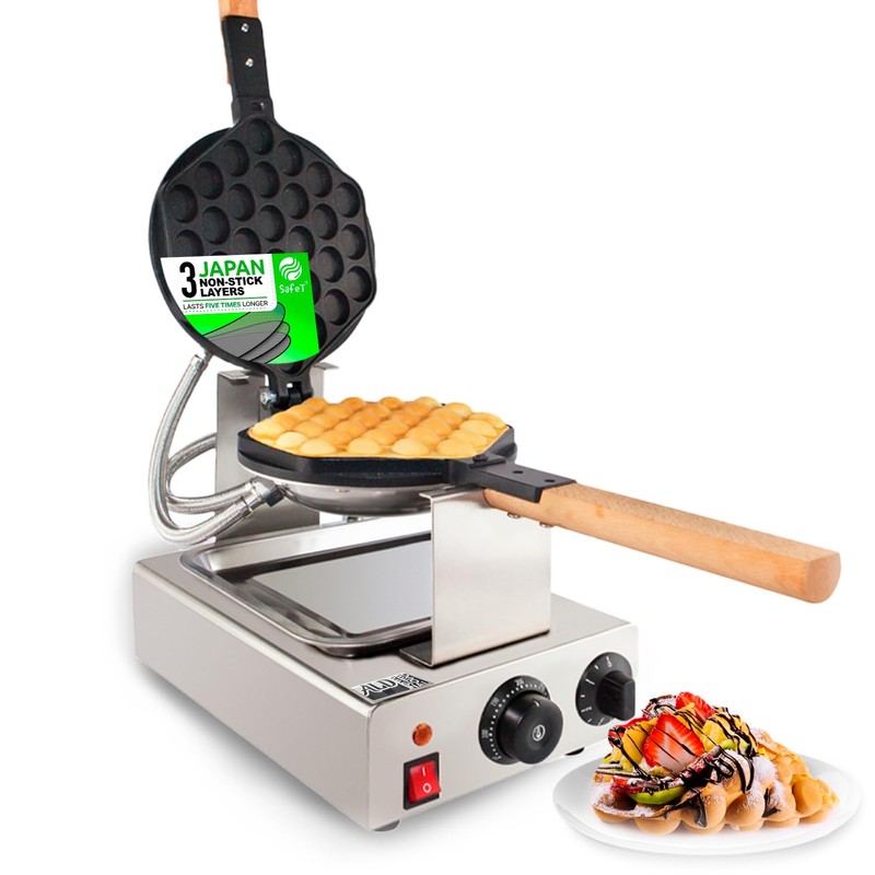 - ✪ SIMPLE OPERATIONS: There is no particular training needed to start using this Bubble Waffle maker right away. All the operations are simple and comprehensible. Start the machine with an on/off switch on the front panel, adjust the desired heat level on a digital display or with a mechanical knob, and set the cooking time with a timer knob.