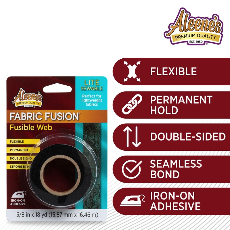 - Includes (1) 5/8 in x 18 yd roll of AleeneFabric Fusion Lite Fusible Web (Black)