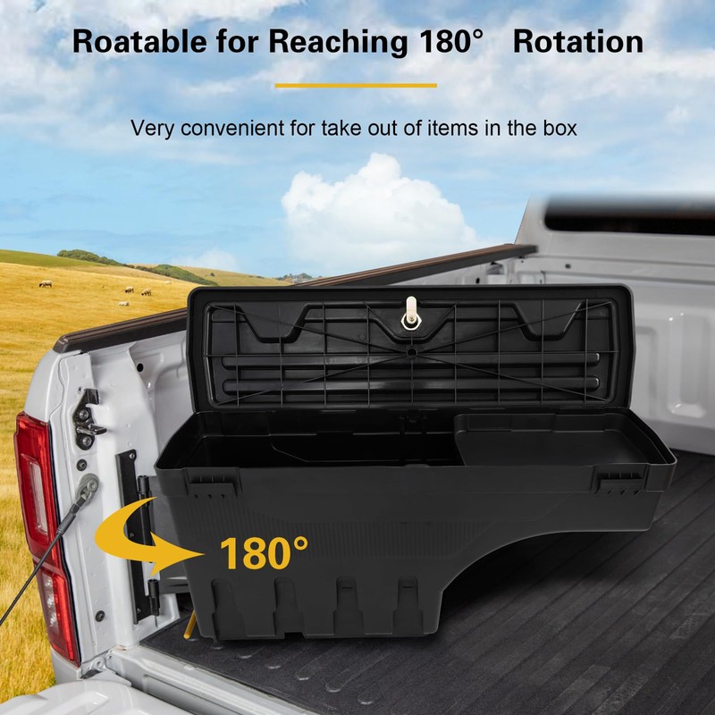 - Can be Rotated: This tool box swings out nearly 180° towards you for easy access from the tailgate & swings back into a locking position over the wheel well for maximum bed access