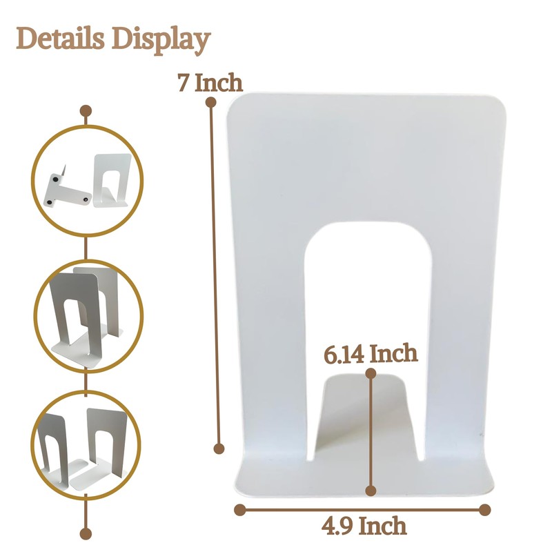 - High Quality: this Metal book ends made of sturdy metal and painted in the oven, its measurements are 7 inches high, 4.9 wide and 6.14 inches at the base structure; the base is the part that remains under the books. This design ensures the stability.