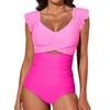Aleumdr 2025 Trendy 2 Piece Tummy Control Tankini Swimsuits Cross Criss Bathing Suit Ruffled Cutout Tank Top with Bikini Briefs Color Block V Neck Swimwear Hot Pink X-Large