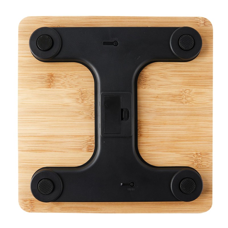- SPECIFICATION: Max Capacity: 150kg (23 Stone) | Dimensions: 28 x 28 x 3cm | Material: Natural Bamboo | Display: Digital LCD with Backlight | Power: Battery Operated (not included) | Features: Auto Zero, Auto-Off, Non-Slip Base