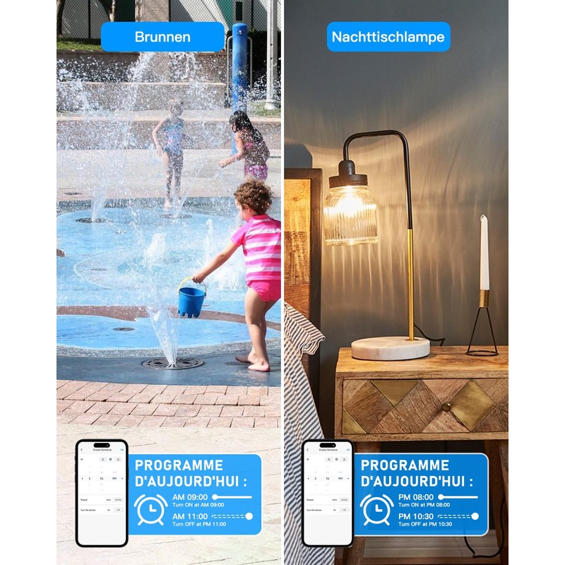 - Outdoor timer of the WiFi socket: the smart socket is suitable for all devices under 3750 W (16 A/2.4 GHz). WLAN socket is usually easy to set up. They are simply plugged into a normal socket and then connected to the Wi-Fi network via a smartphone app.