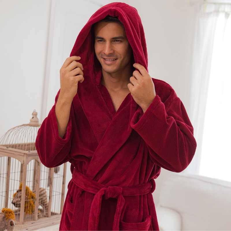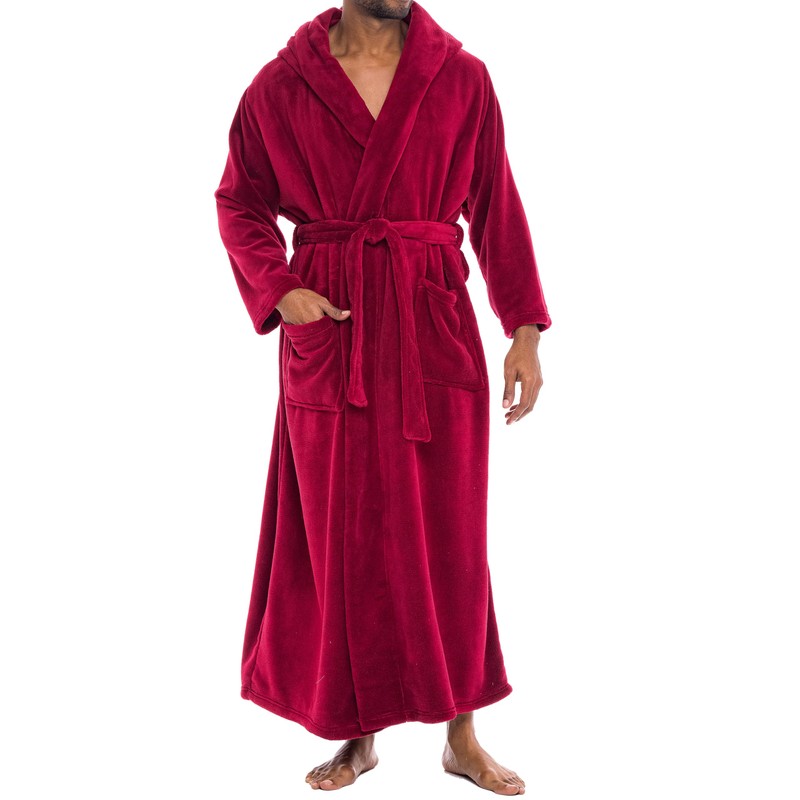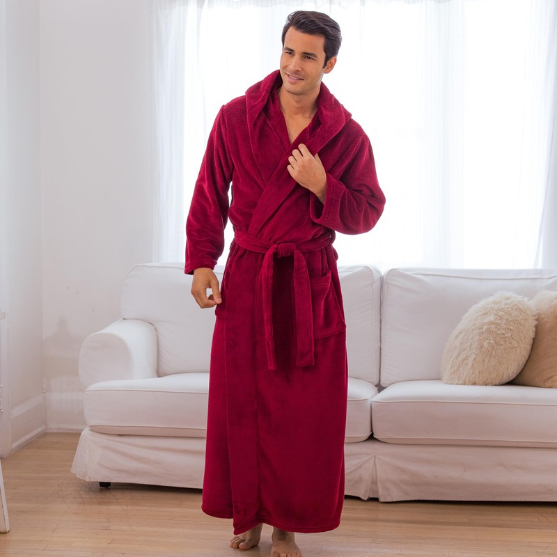 - THICKER - 2 times thicker than the average fleece bath robe male, spa robe, mens robe with hood and pockets. Not a fuzzy robe, more of a sleek, soft, thick fleece plush robe. Big and tall size XL tall, burgundy robe by Alexander del Rossa.
