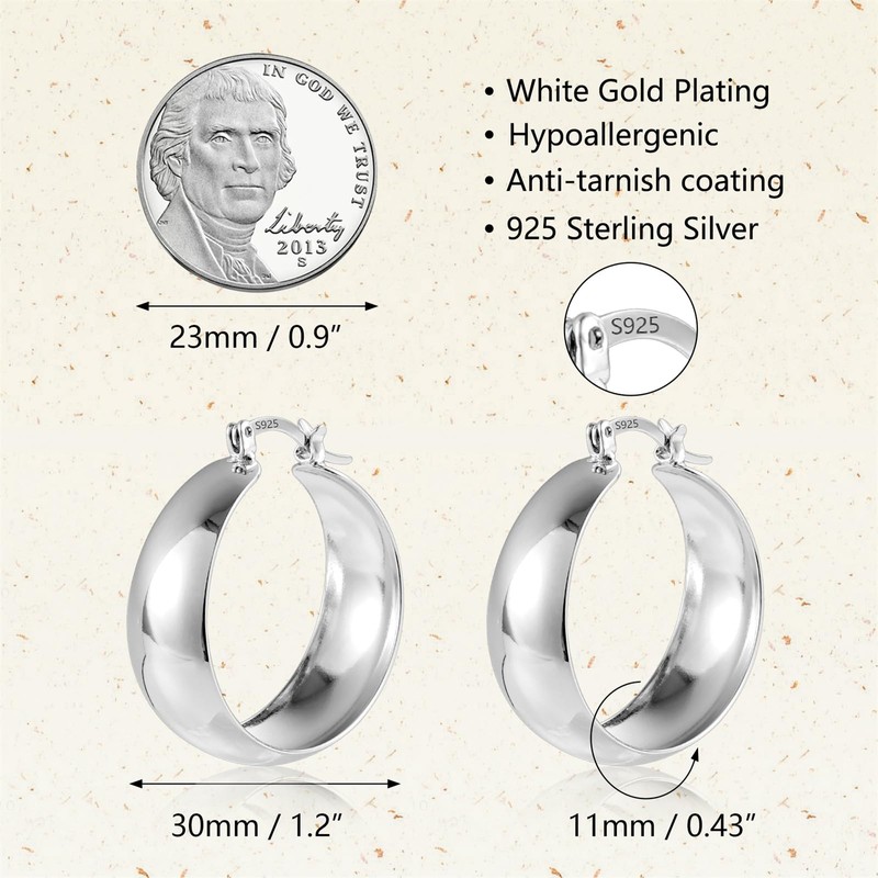- ❤Stylish Large Wide Hoop Earrings: 30mm in diameter, 11mm at the widest point, great size for most people. And the super cute large silver hoop earrings feature lightweight rounded hoop design, very easy to put on and take off, and you can't feel the presence at all. And click-top closure ensures a comfortable wearing experience, suitable for all women.