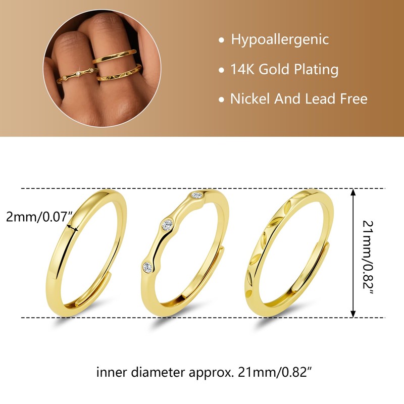 ALEXCRAFT Gold Ring Set for Women - 3-Piece Adjustable Thin Ring Set Hypoallergenic 14K Gold Plated Cubic Zirconia Floral Smooth Designs Lightweight Stackable Rings Size 6-8