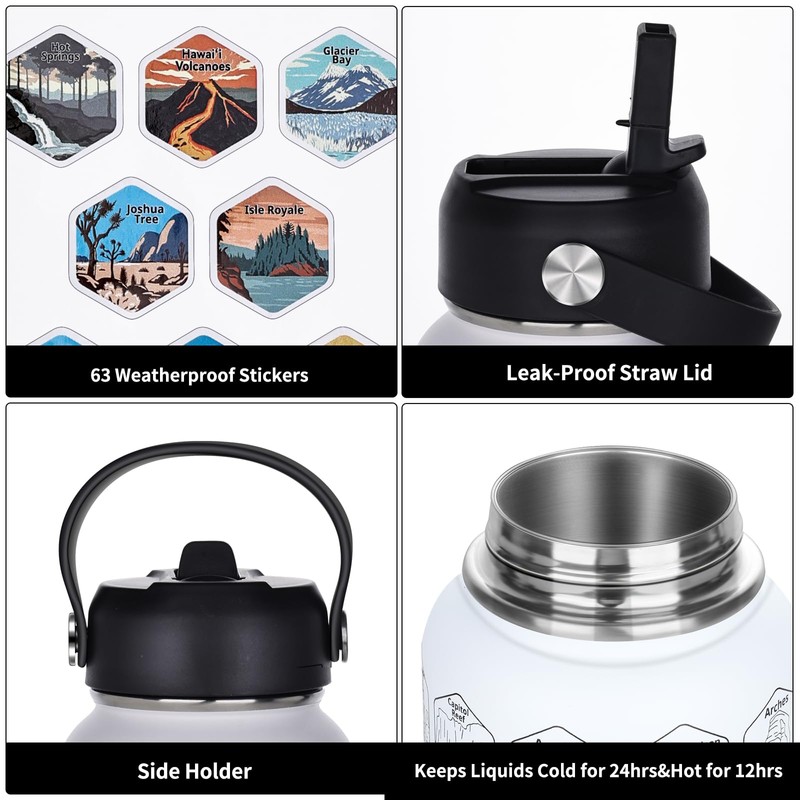 ALEXPRE 63 National Parks Water Bottle with Water Proof Stickers,32 oz Leak Proof Insulated Stainless Steel Water Bottle with Straw,National Park Gifts for Hiking,Camping&Travel(White)