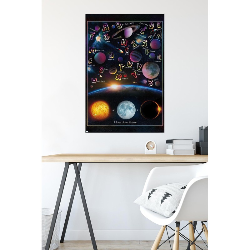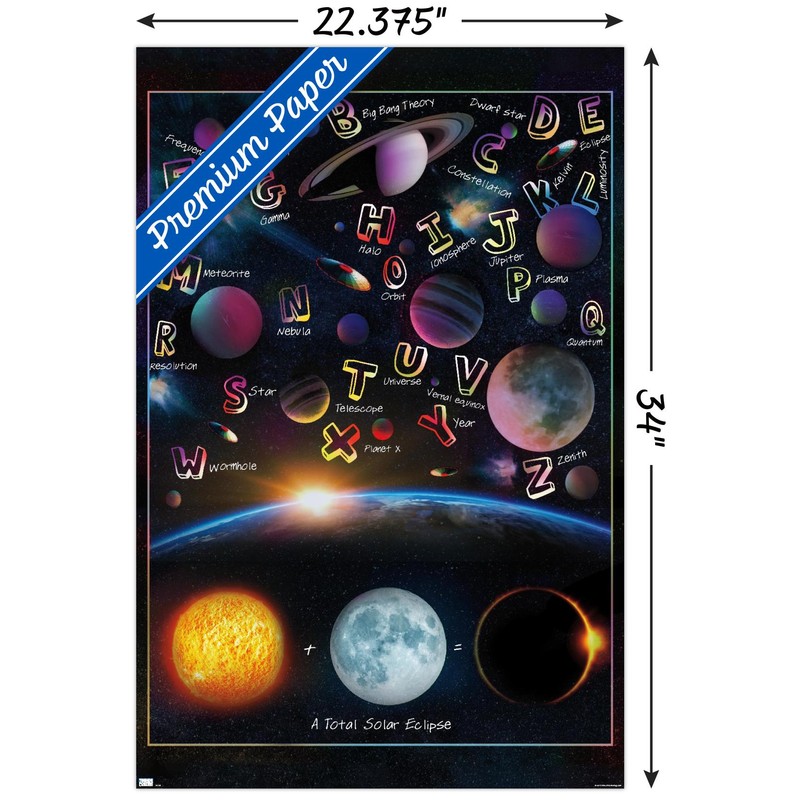 Trends International wall posters are everyone's favorite room decor! This Ali Chris - The Solar System: Total Eclipse Letters Wall Poster is created with high-resolution artwork and is printed on glossy poster paper which enhances the colors to make a bold wall decor statement in any room. Decorate the bedroom, bathroom, kid's room, living room, office, dorm, and more! Our art prints are lightweight and easy to hang using the included adhesive poster mounts that won't leave holes in your poster or damage your wall like nails, thumb tacks, or push pins. Every one of our premium posters are proudly Made in the USA. Add these decorations alongside the other accessories on your party supplies list too! Trends International's wall posters are the perfect way to dress up your parties. Poster bundles make great gifts as well! Whether it's for a birthday, Christmas, house warming or for your best friend, they'll love receiving a poster and mount bundle to show off their style.