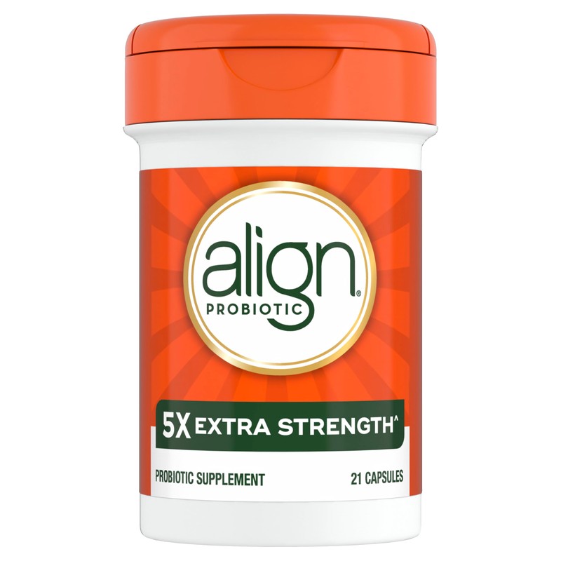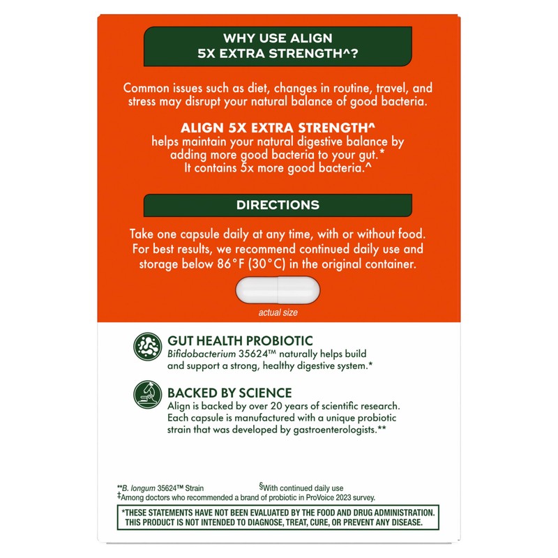 THE PROBIOTIC BRAND DOCTORS RECOMMEND MOST.?Recommended by Gastroenterologists two times more than any other probiotic, Align daily probiotic supplement is the #1 doctor and gastroenterologist recommended probiotic brand? Align Extra Strength^ is a daily probiotic supplement that fortifies your gut with 5X the good bacteria^ to help you maintain digestive balance.* Align Extra Strength Probiotic contains the unique strain Bifidobacterium 35624 TM, which was developed by Gastroenterologists and backed by 20+ years of research, and naturally helps soothe occasional abdominal discomfort, gas, and bloating.* Taking one capsule a day helps to maintain your digestive system's natural balance*. Align Extra Strength Probiotic is vegetarian, gluten-free, soy-free and does not require refrigeration. *THESE STATEMENTS HAVE NOT BEEN EVALUATED BY THE FOOD AND DRUG ADMINISTRATION. THIS PRODUCT IS NOT INTENDED TO DIAGNOSE, TREAT, CURE, OR PREVENT ANY DISEASE. ?mong Doctors and Gastroenterologists who recommended a brand of probiotic in ProVoice 2022 survey ^vs. Align Probiotic Capsules ?ith continued daily use