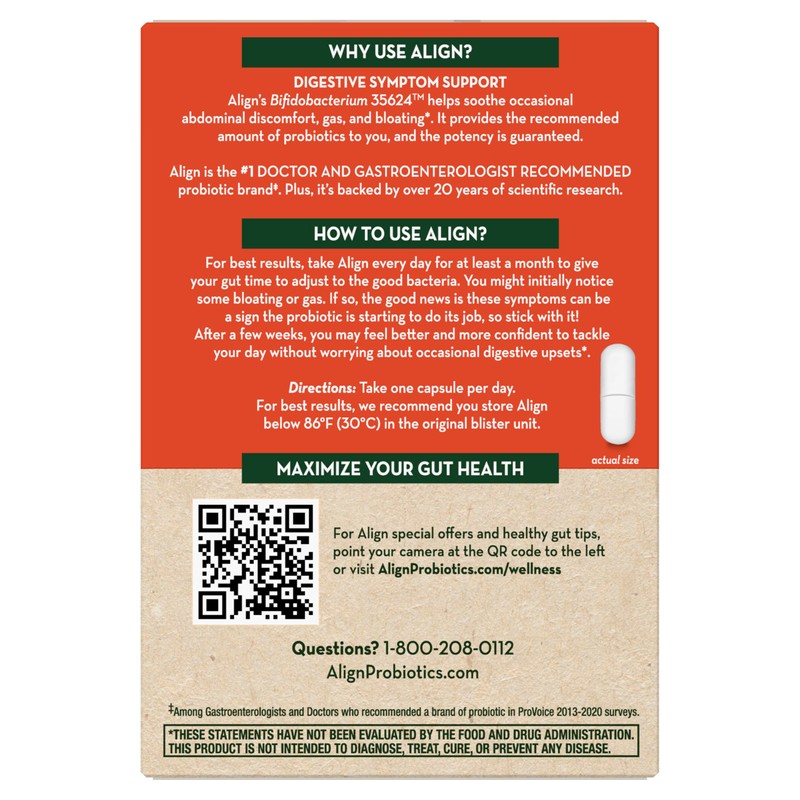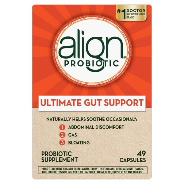 THE PROBIOTIC BRAND DOCTORS RECOMMEND MOST?. Recommended by Gastroenterologists two times more than any other probiotic, Align daily probiotic supplement is the #1 doctor and gastroenterologist recommended probiotic brand?. Good bacteria are essential for many bodily functions, including healthy digestion. However, common issues such as diet, travel and stress can disrupt the natural balance of bacteria in your digestive system. Discovered by Gastroenterologists and backed by 20+ years of research, Align Probiotic contains the unique strain Bifidobacterium 35624 and naturally helps soothe occasional abdominal discomfort, gas, and bloating*. Taking one capsule a day helps to maintain your digestive system's natural balance. Align Probiotic is vegetarian, gluten-free, soy free and no refrigeration is required. *THESE STATEMENTS HAVE NOT BEEN EVALUATED BY THE FOOD AND DRUG ADMINISTRATION. THIS PRODUCT IS NOT INTENDED TO DIAGNOSE, TREAT, CURE, OR PREVENT ANY DISEASE ?Among Doctors and Gastroenterologists who recommended a brand of probiotic in ProVoice 2021 survey
