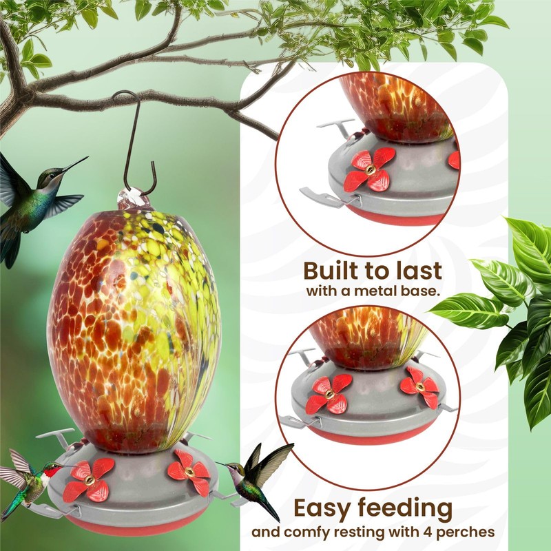- Colores impresionantes: nuestro colorido diseño de vidrio soplado a mano atraerá a los colibríes. A medida que la luz llegue a tu comedero, los colores brillantes invitarán a los colibríes a tu patio, jardín, ventanas de cocina y sala de estar o habitación familiar. Cuelga este comedero en cualquier lugar con el gancho en S incluido, añadiendo color extra a tu hogar mientras atrae a los curiosos y emocionantes colibríes que son increíbles de observar mientras se alimentan.