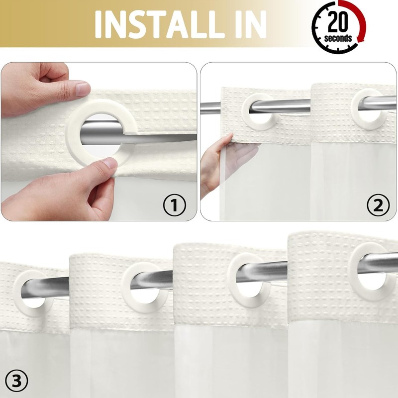 - 【No Hook Shower Curtain Set】: Install in 20 seconds without the hassle of annoying and messy hooks, and no need to remove the rod!
