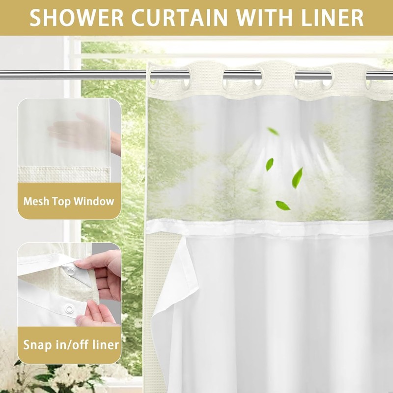 - 【Hotel and Spa Vision】: This no hook waffle shower curtain with a snap-on liner set creates a hotel-inspired bathroom. You'll feel like you're pampering yourself at a hotel spa whenever you take a shower. You will love the fit of the shower curtain and the fact that it has an inner liner. The outer layer does a great job of wicking water to keep it dry;
