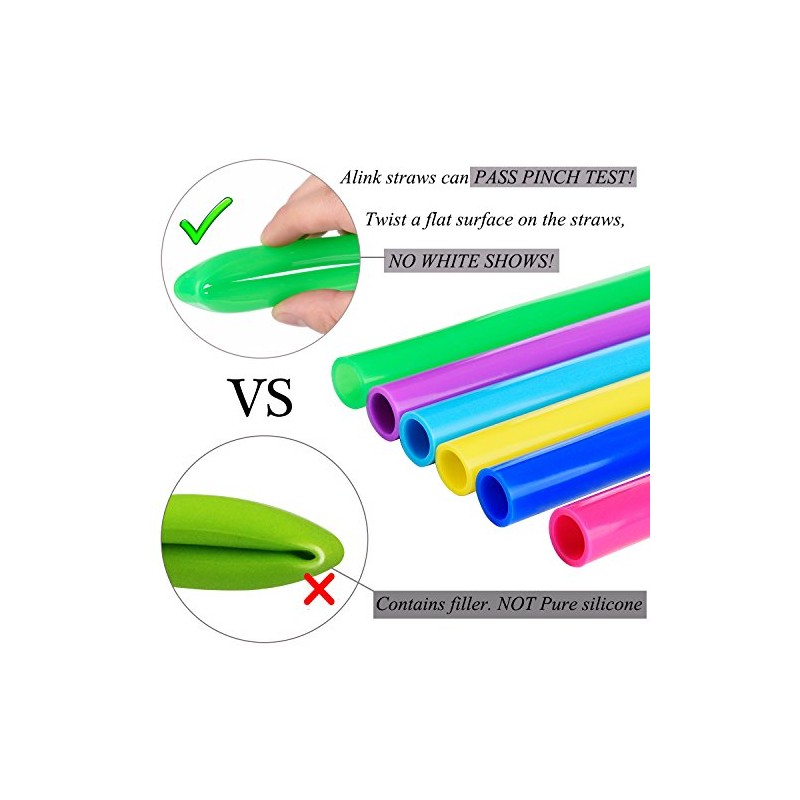 **Why Choose Alink Silicone Straws?** **All Alink Silicone Straws Can Pass Pinch Test!** Here's an excerpt from an article from a January 7th 2010 **NY Times** Food section: The better silicone products cost more than the glass or metal ones they replace. Some of them are worth it. But beware: not all silicone is created equal. To reduce costs, some manufacturers add fillers to the product. Luckily there is **a simple way to tell: pinch and twist a flat surface on the item.** If white shows through, the product contains filler. Pure silicone does not change color when twisted. **YOU CAN DRINK THICK SMOOTHIE AND BUBBLE TEA** The opening reach approx 14 mm, which means you can see how easy the boba or even the most thick smoothies come out. The flexibility and softness make sure the straws can hold its shape when bent sharply. **PERFECT FOR HOT AND COLD DRINKS** Silicon can handle hot or cold drinks (-80℃~250℃). If you are looking for something safe to drink hot liquids through, don’t miss Alink silicone straws! **SAFE FOR KIDS AND PREVENT TEETH STAINNING** It’s very dangerous to let kids use hard plastic straws or metal straws, wich accidentally scraping up their mouth sometimes. With our soft silicone straws, they can drink without any risk, they won’t break the straw from chewing on it, or crack it from bending it. They can drink at any angle. **WORK GREAT FOR PREGNANT WOMEN, THE AGED AND BED-RIDDEN.** For pregnant women, our non-leaching medical grade silicone straws can reduce the exposure to the endocrine disrupting chemicals from plastics such as BPA, which can cause birth defects.