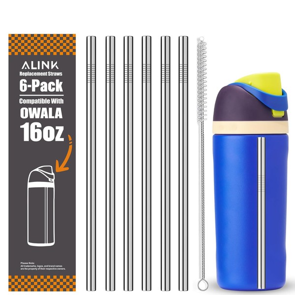 ALINK Stainless Steel Straws for 16oz Owala FreeSip Insulated Water Bottle, 6 Pack Reusable Metal Replacement Straws Compatible With 16oz Owala Freesip Cup Lid Only, Plus Straw Brush, Dishwasher Safe
