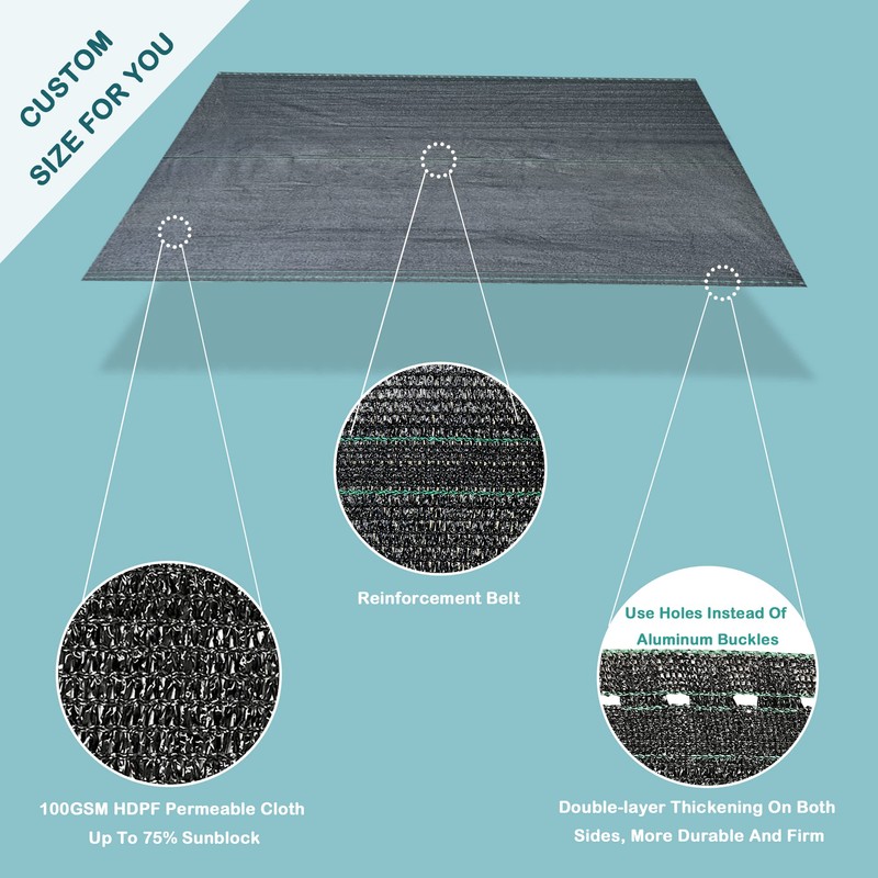 - HIGH QUALITY UV STABILIZED MATERIAL - 100GSM knitted high density polyethylene that blocks approximately 75% of direct sunlight. UV stabilized material will not tear from edges or fray if cut. Reinforced design in the middle of the cloth to help withstand wind and tension.