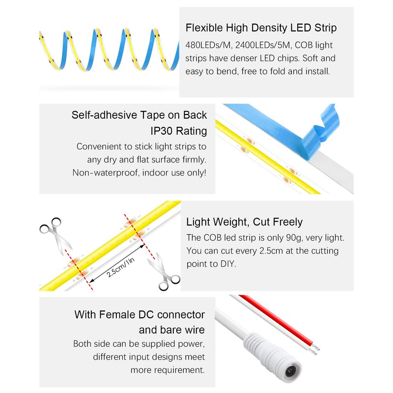 - Strong self-adhesive: IP30 not waterproof, on the back of the COB strip light there is a stronger self-adhesive tape that can be easily glued to any clean and dry surface. The flexible LED strip light gives you plenty of flexibility to achieve the desired length and shape to meet different requirements without damaging the remaining LEDs.