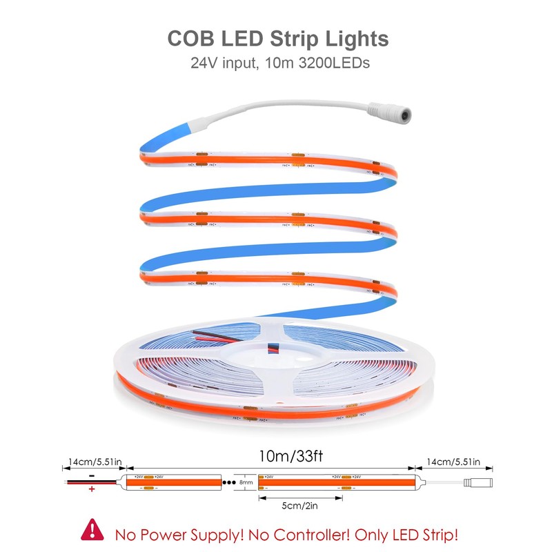 • 10 m long design: the continuous length of 10 m (not 2 x 5 m) is suitable for lighting projects that require a long and high-quality LED strip. Thanks to the 8mm wide FPCB board and light weight, our 10m COB LED strip is much easier to hide or install in narrow grooves. This clearly covers a wide area to allow for a lot of creativity.