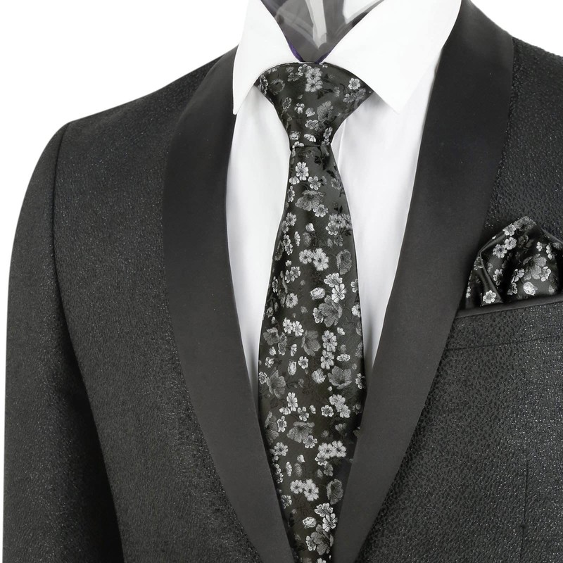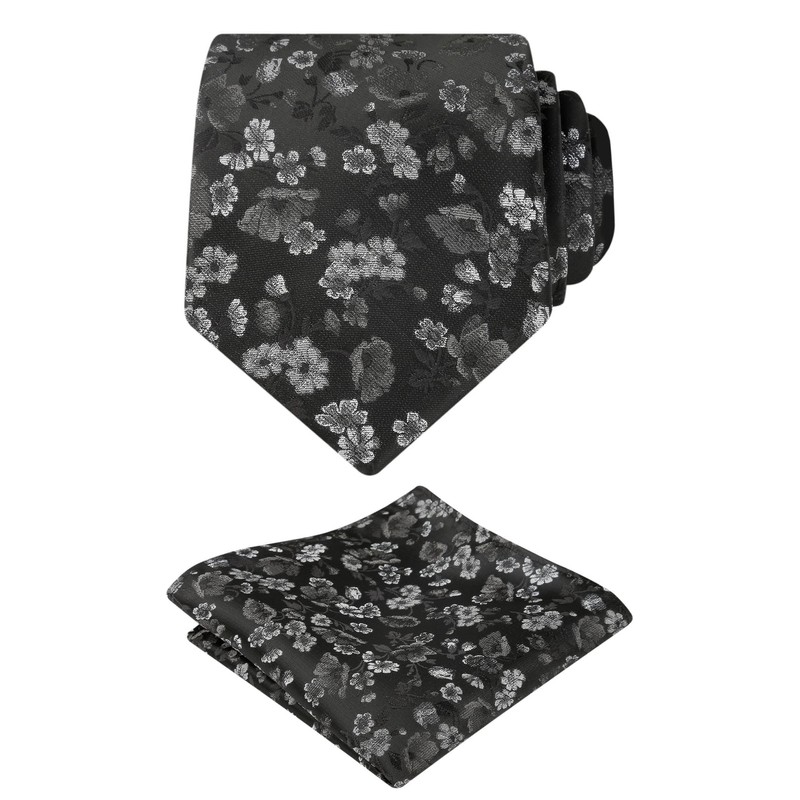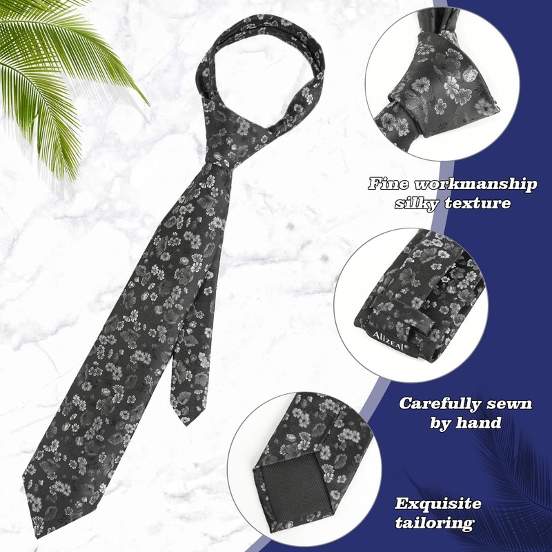 Alizeal Mens 3.15inches Flower Patterned Tie with Floral Printed Pocket Square, Black+White-new