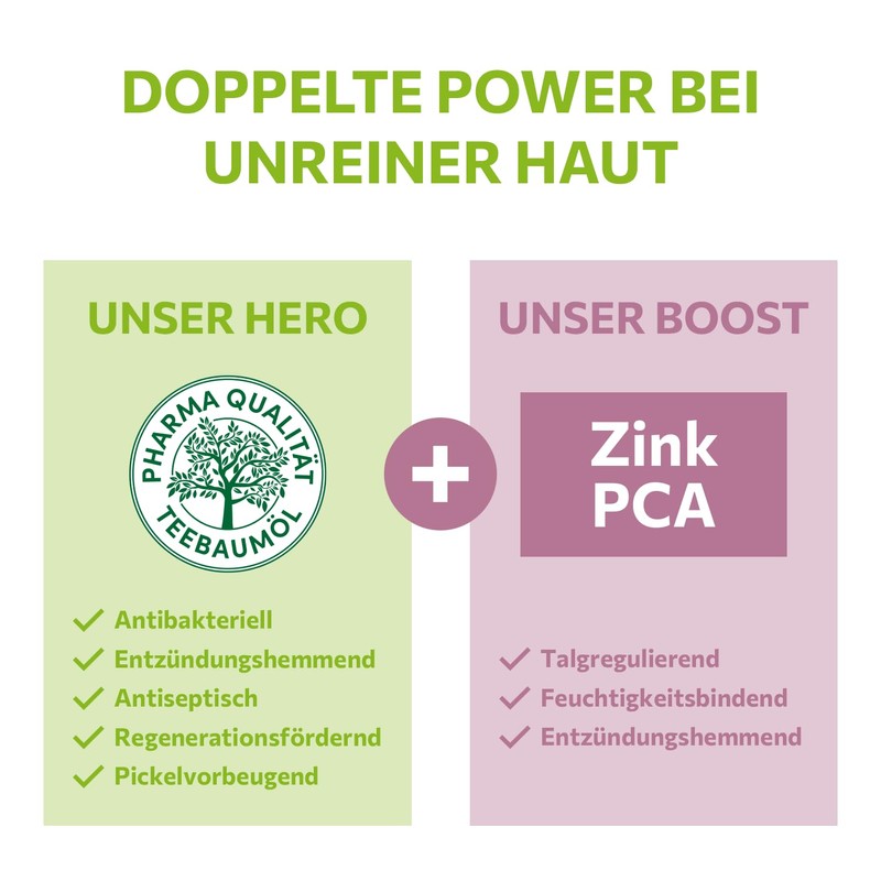 • Active ingredients: zinc PCA for an even complexion, contracts enlarged pores, regulates sebum production and protects against drying out - natural tea tree oil in pharmaceutical quality has an antibacterial and anti-inflammatory effect