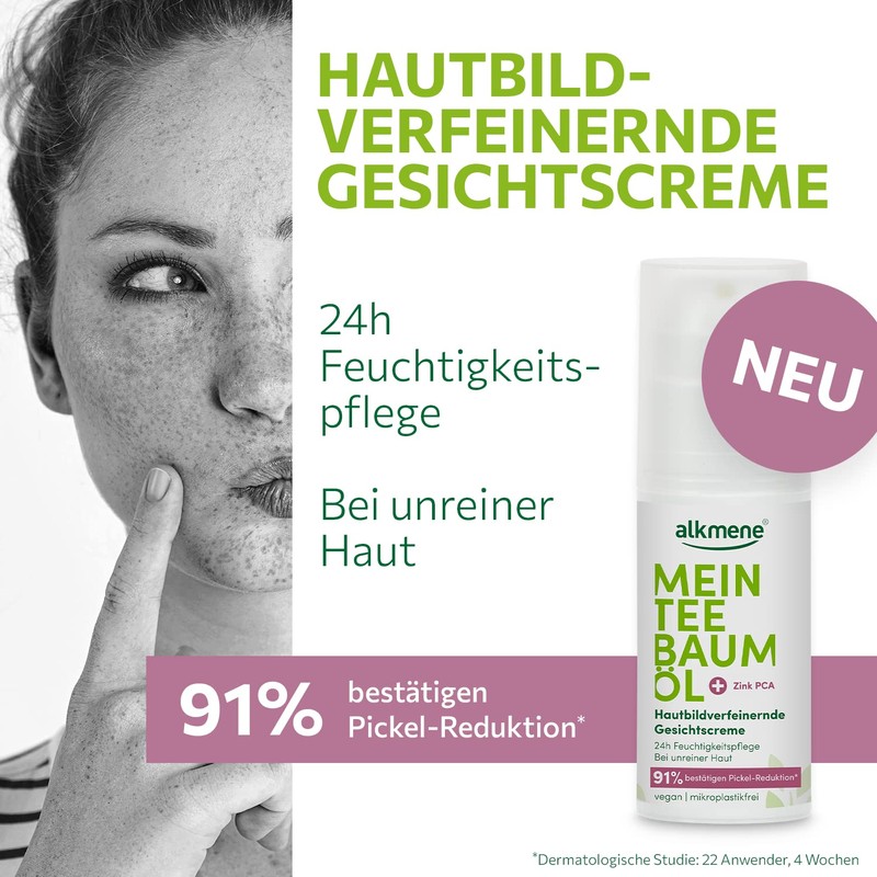 - Box contents: 1 x 50 ml alkmene skin-refining face cream with tea tree oil and zinc PCA - 91% confirmed pimple reduction - non-comedogenic
